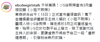 自去年2月經歷大S猝逝後,小S宣布無限期停工,早前她在金鐘獎與蔡康永合體,並憑《小姐不熙娣》奪得金鐘獎時,便有透露最快將在過年後才會重投工作,今日(13日)她便驚喜發文正式宣佈回歸這個由姐姐大S促成,連節目名稱都是大S想的節目《小姐不熙娣》,連一同主持節目的搭檔派翠克都轉發小S貼文,並配字「我姐要回來了」,令人十分鼓舞!