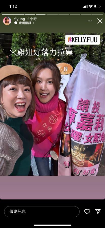 傅嘉莉除了在社交平台積極拉票外,早前更初嘗直播帶貨,甚至化身火雞姐上身向網民高呼:「唔買唔係兄弟!」。在直播中吸引約2千多名觀眾收看,最後Kelly當然都不忘向網民拉票,呼籲各網民姊妹投自己一票:「我都係好似第一次咁樣公開同觀眾拉票,希望大家支持08(飛躍女候選號)、29(女配候選號)!」