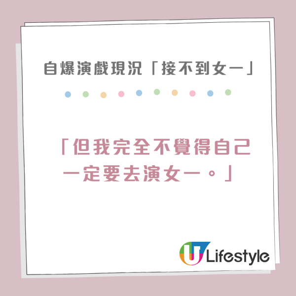 「我覺得現在沒有女一演了,很難!但我完全不覺得自己一定要去演女一,因為過去已經演過很多很乏味的女一(角色)」,並直言自己情願演一個有趣的角色,女二女三都會接受,就算演老太婆都可以。更指當時拍這套劇相當辛苦,經常穿梭中港兩地,情願犧牲休息時間,都要見老公以及三個寶貝仔一面,真的是位好媽媽以及好老婆!
