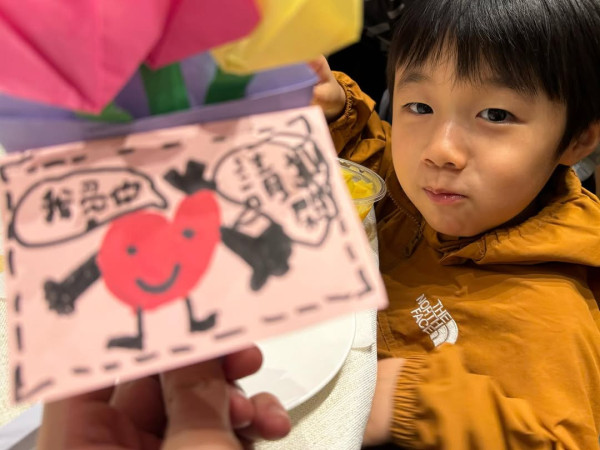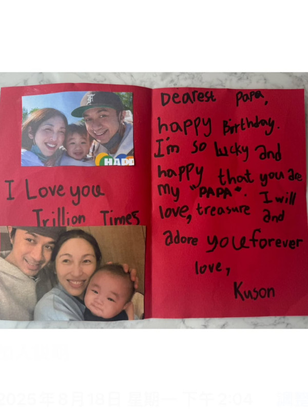 向來寵愛仔仔的古巨基,亦不忘展示Kuson的才華,他分享Kuson親手設計的創意揮春,除了工整地寫下「龍馬精神」及「大吉大利」等祝賀語,Kuson更發揮想像力,在揮春上畫出維妙維肖的「桔仔」,展現出遠超同齡小朋友的藝術天分。