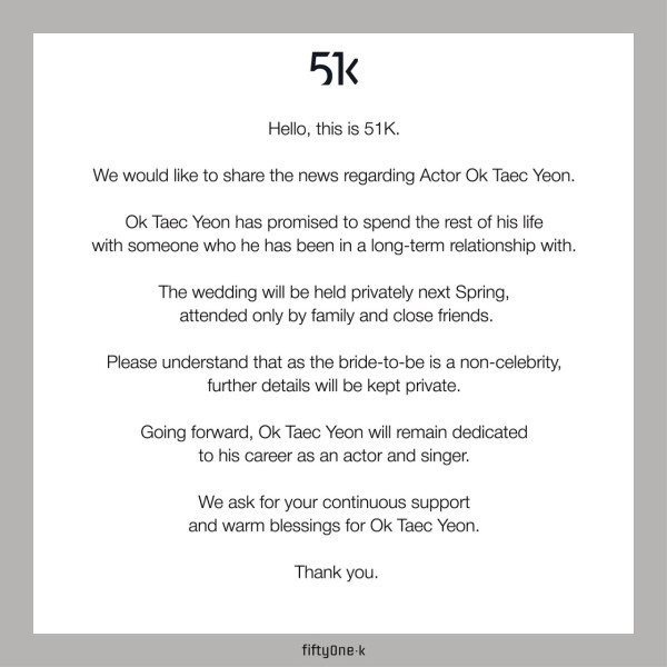 玉澤演的所屬經紀公司51K也同步發表官方聲明證實婚訊,聲明中提到婚禮將於明年春天(2026年春季)在首爾某處舉行。由於新娘是非藝人,為尊重雙方家庭及保護私隱,婚禮將只邀請雙方家庭、親戚與親近友人出席,並以非公開形式進行。
