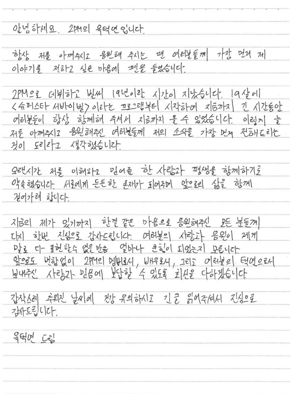玉澤演在親筆信中,首先感謝粉絲長達19年(自19歲參加《Super Star Survival》節目起)的支持。他形容未婚妻是「一位長久以來理解並信任我的人」,兩人約定要共度一生,成為彼此堅定的依靠。最後,他向粉絲大派定心丸,承諾婚後會繼續努力:「感謝至今為止始終如一支持我的所有人...大家的愛與應援對我來說,是無法用言語完全表達的巨大力量。今後我也會一如既往,作為2PM的成員、作為演員,也作為玉澤演,竭盡全力回報大家給予我的愛與支持。」