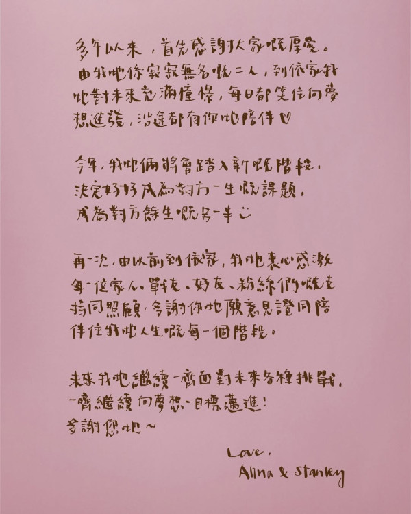Stanley透露兩人是在旅行途中完成這件人生大事,當時身邊只有一位外籍友人見證。他對求婚地點保持神祕,僅浪漫表示:「那地方可能一生人只會去一次。」他更指求婚的瞬間,Alina感動到當場大喊,又指她的反應十分搞怪,Alina嫌棄當天的衣着不夠漂亮,所以後來特意補拍一輯穿著精緻白裙的靚相,才正式向大眾公佈喜訊。