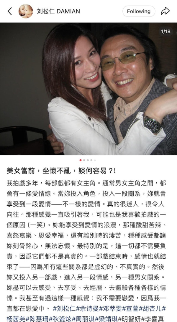入行多年的劉松仁拍過無數經典神劇,以上的「親密照」其實通通都是他昔日的好拍檔!劉松仁感性又幽默地發文大談感受:「美女當前,坐懷不亂,談何容易?!」他直言每拍一部劇都會全心投入愛情線,享受與女主角的愛情,卻無需在現實中負責,戲散情終後又再投入新戲。他更爆出金句:「我不需要戀愛,因為我一直都在戀愛中!」 有網民見狀,大膽留言推斷劉松仁當年曾經「戲假情真」愛上對手,劉松仁鬼馬地親自回覆:「唔話你知。」 留下無限遐想!