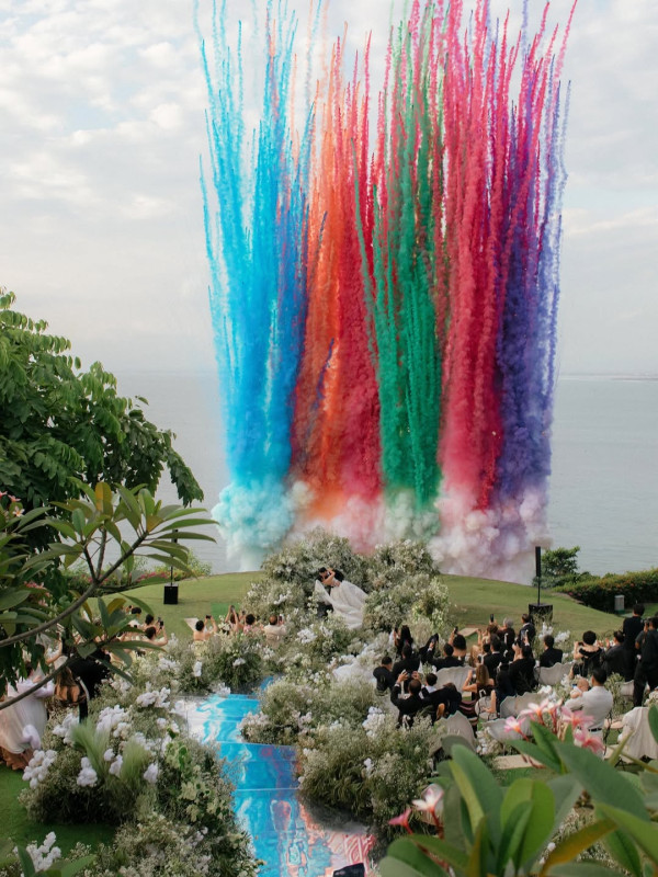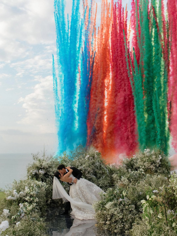 早前Linna透露因為颱風樺加沙襲港,香港機場航班大亂令到原定到當地出席觀禮的好友和家人,都要重新安排時間,讓原本已經感到非常緊張的她更加擔心,幸好最後一眾親朋好友都全力調整行程,順利抵達峇里島出席婚禮。而Linna的圈中好友蘇韻姿和林至昭都有現身婚禮,見到婚禮佈置成一片花海,一對新人更在安排好的彩色煙火激情擁吻,場面非常浪漫!