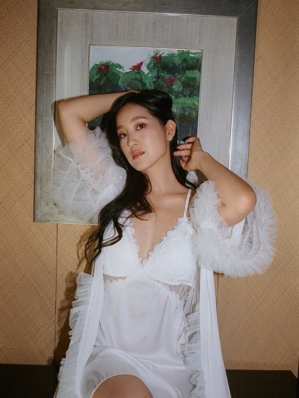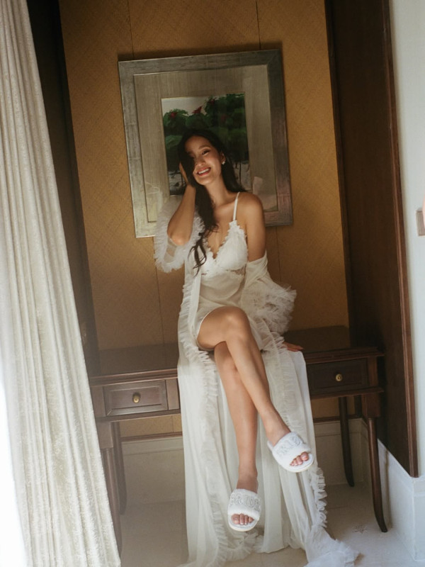 照片中,Linna更以一身極致誘人的白色低胸Deep V吊帶睡衣裙上陣,外搭一件若隱若現的透視蕾絲睡袍,造型讓她的凹凸有致曲線展露無遺,更將她一雙白滑修長美腿完美呈現,火辣程度爆燈!儘管造型性感迷人,但Linna的眼神與笑容中卻始終洋溢著待嫁新娘的甜蜜與平靜。
