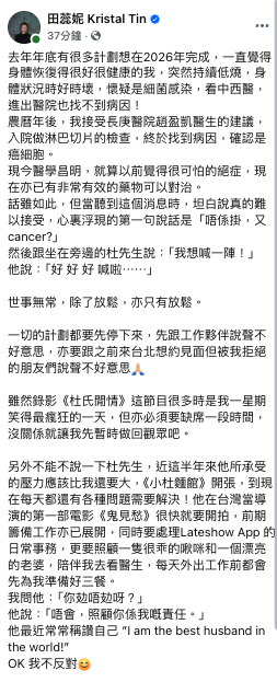 與老公杜汶澤一向是圈中著名的恩愛夫妻,田蕊妮直言確診後杜汶澤比她更緊張,更大爆杜生從見醫生都到安排入院做手術都詢問得很清楚詳細,由她該做那一種手術到手術中和手術後的情況,醫生和醫護都很有耐性非常清楚地解答他的問題...她更在文末特意表揚他 :最後當然要感謝杜先生,整個過程的安排和照顧,真的要跟你講一句「有你真好」,十分甜蜜!