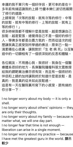 在文中田蕊妮透露去年年底有很多計劃想在2026年完成,並且認為身體恢復得很好,但突然身體持續低燒,「身體狀況時好時壞,懷疑是細菌感染,看中西醫,進出醫院也找不到病因!」最後在新年過後接受台灣醫院醫生建議,入院做淋巴切片的檢查,終於找到病因,確認是癌細胞。她表示當時得知消息後難以接受,「心裏浮現的第一句說話是「唔係掛,又cancer?」其後田蕊妮亦轉換心情,提醒自己要放鬆,「一切的計劃都要先停下來,先跟工作夥伴說聲不好意思,亦要跟之前來台北想約見面但被我拒絕的朋友們說聲不好意思。」但幸運的是,田蕊妮指現今醫學昌明,有非常有效的藥物可以對治。