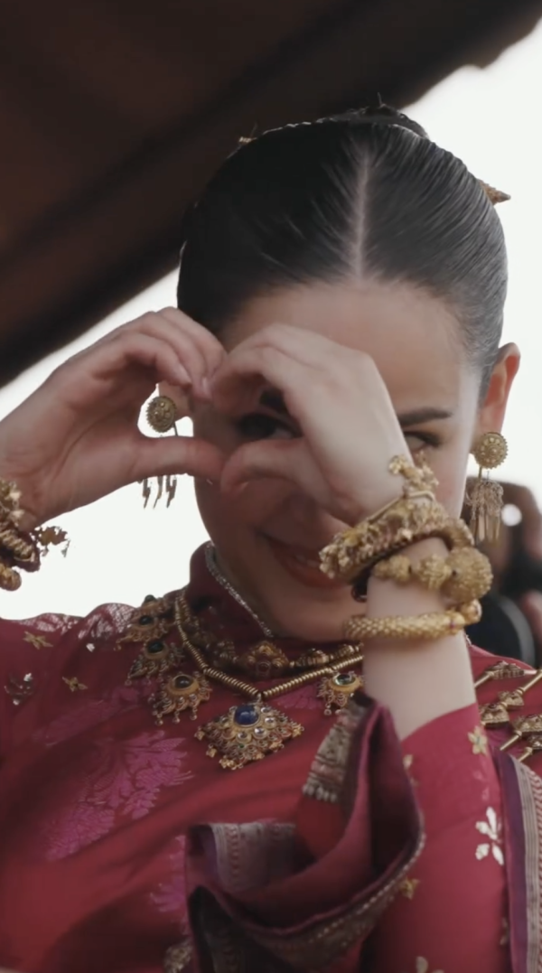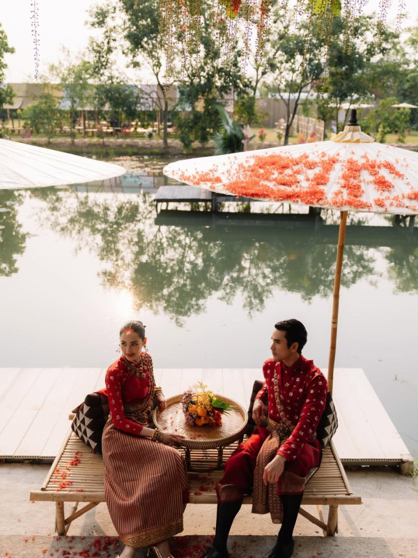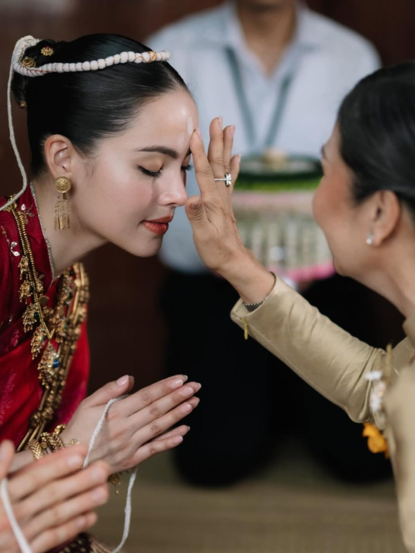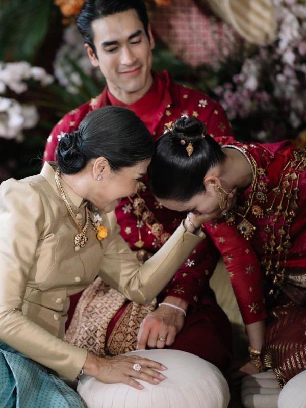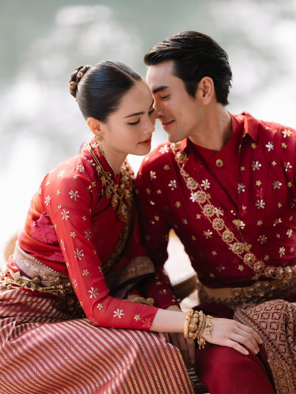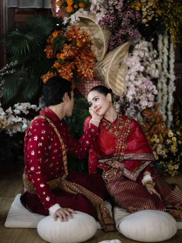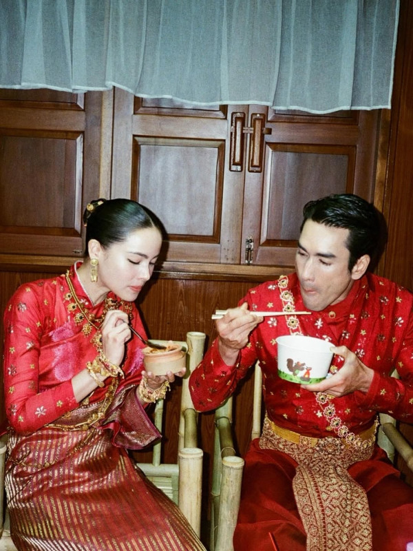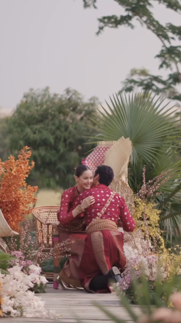 Yaya與Nadech分別在社交平台上洗版,一同分享婚禮的幸福點滴。這場別具意義的首場婚禮,特意選在男方 Nadech的家鄉Khon Kaen舉行。當日,兩人換上紅色泰式傳統服飾,Nadech帶領伴郎團去接新娘,而Yaya的家姐則在門口把關玩遊戲,各種互動讓現場笑聲不斷,氣氛極佳!從相片中可見,Nadech單膝跪下深情望著Yaya,兩人又在田園的景色下甜蜜熱吻,畫面就如偶像劇般浪漫!