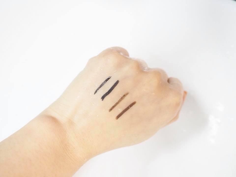 先講講眼線筆,無論黑定棕色都好,只需要輕輕一畫就極易上色,畫起嚟柔軟順滑,濕潤度好不錯。不過眼線筆對於油眼女生來說,夏天時使用數小時後,會有少少甩色問題,但勝在用後好自然,如果油眼女生使用,建議眼肚位置上定少少碎粉減低脫妝問題。