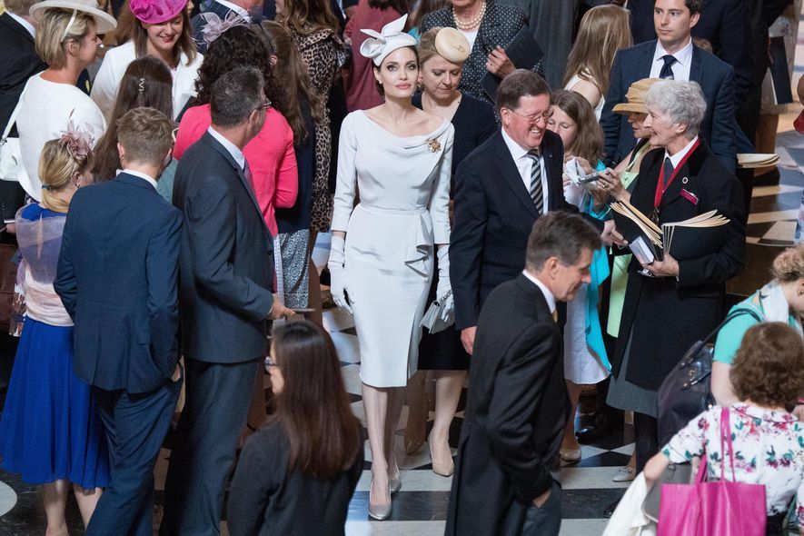 不得不提的是,Angelina在右肩位置戴上一個金色胸針,這其實是她於2014年於白金漢宮,獲英女皇頒發的「聖米迦勒及聖喬治勳章榮譽爵級大十字勳章」(Honorary Dame Grand Cross of the Most Distinguished Order of St Michael and St George),以彰顯她在結束戰區性暴力運動和慈善事業的努力,意義非凡。