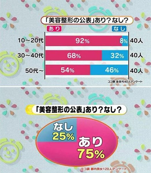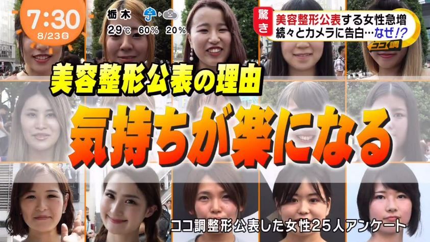 日本富士電視台節目《めざましテレビ》調查發現,近年許多年輕女生不但熱愛整容,而且還喜歡於社交網分享經驗,吹起了社交網公開整容的風潮。據統計,120名曾整容的人士中,有75%曾公開整容;仍保守秘密的只有25%。另外,有調查發現超過9成10至20代年輕人曾公開整容。