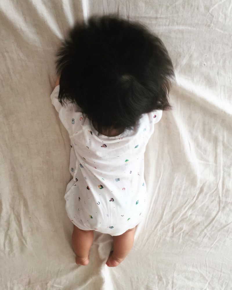 還是嬰兒時的她,髮量明顯比一般的寶寶多,而且又濃密,尤其是躺在床上的照片,散開的頭髮跟細小的身驅相比,頭部看起來好像特別大,真的很可愛啊!