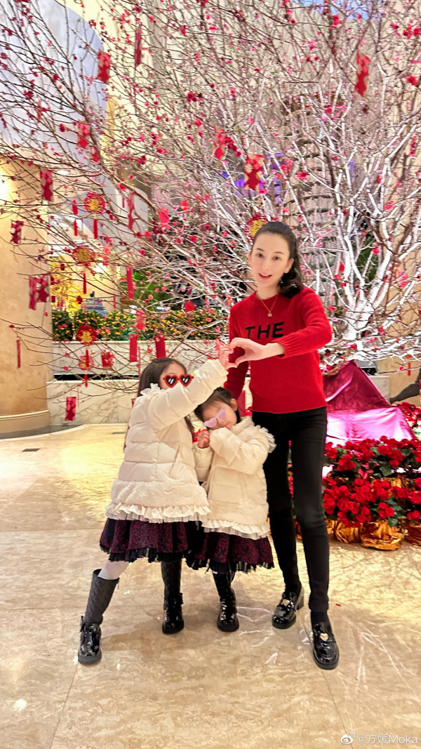 「天王嫂」方媛在社交平台分享一家四口的全家福,在帖文中為一眾網民送上新年祝福,似乎心情大好。相片可見,方媛和郭富城攜同一對女兒在桃花樹下打卡,二人露出幸福笑容,雙手均護在愛女身旁,場面溫馨。雖然,愛女心切的方媛為一對女兒用上「墨鏡」貼圖遮蓋容貌,不過,兩名女兒的甜美外型,依然成為網民的焦點。