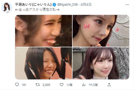 現年25歲的日本女網紅平瀬あいり,近日在社交平台公開自己整容前後的照片。平瀬あいり表示,自己從小因為容貌而遭受不少惡意抨擊。早在5歲時,平瀬あいり更曾因自身容貌被嘲笑:「因為我的臉,被告知我不應該生孩子,我至今仍清楚記得」。過往的經歷令她感到非常難過,自信心大受打擊。