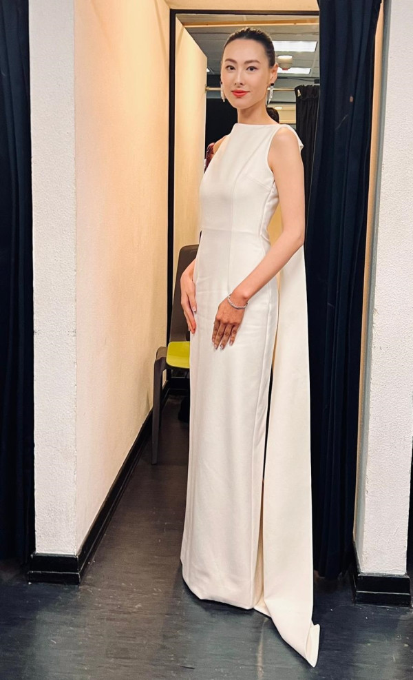 而在頒獎典禮上梁洛施則換上由 NET-A-PORTER 提供的全白色Safiyaa垂墜彈力縐紗禮服,完美襯托梁洛施的低調知性美,造型簡約又不失隆重感,而且身材保養得宜,完全看不出已是三孩之母,成功艷壓全場。