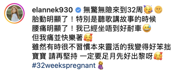 Elanne在帖文表示:「無驚無險來到32周,胎動明顯了!特別是聽歌講故事的時候,腰痛明顯了!我已經坐唔到好耐車,但我痛並快樂著。雖然有時很不習慣本來靈活的我變得好笨拙,寶寶,請再堅持 一定要足月先好出黎呀。」我們就一起期待Elanne生下肥肥白白的孩子吧!