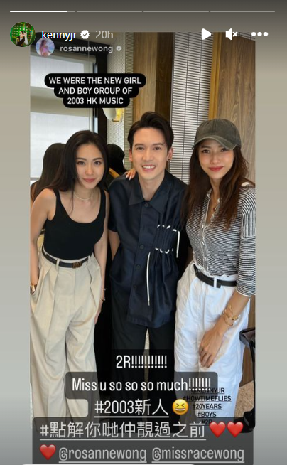 2R與關智斌Kenny於IG Story上曬出三人合照,Rosanne更寫道他們三人同樣是2003年的新人,引起回憶殺!Kenny亦Repost Story並興奮寫上:「2R!Miss you so much!點解你哋仲靚過之前?」網民紛紛大讚三人一樣凍齡有術,時隔21年外貌依然不變,甚至更勝從前。