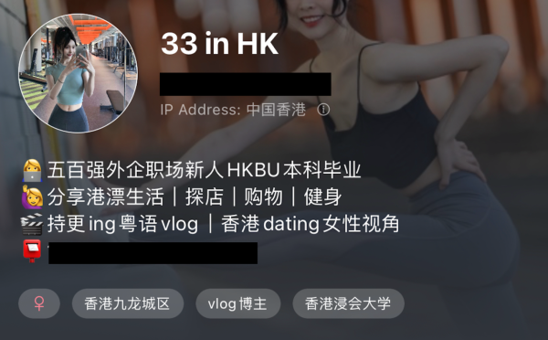 這位名為33的佳麗擁有2.5萬粉絲的小紅書帳號「33 in HK」,她在帳號簡介中提到自己是一位在香港工作的香港浸會大學畢業生,現在在一家五百強外企工作。