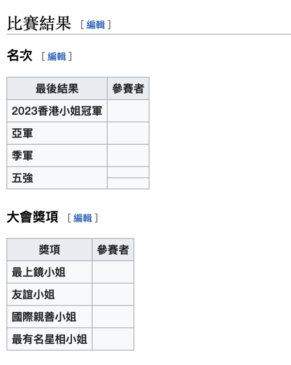 細心眼利的網民於昨晚(7月2日)發現維基百科上的「2023年度香港小姐競選」頁面疑似出現完整比賽結果,並好奇「究竟是內定還是有人亂寫?」。不過今早此「比賽結果」並沒有再出現於維基頁面,未知原因為何。