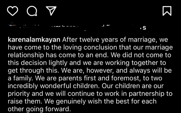 在早前的離婚聲明中,嘉欣強調無論是過去、現在到將來都是一個家庭,二人的身分就是要好好照顧兩個正在茁壯成長的孩子,「我們的孩子是我們的首要和最重要之務,我們將繼續共同合作來撫養他們。對於彼此的未來,我們真摯地希望一切都好。」最後嘉欣請求外界尊重他們及孩子在這個困難時期的空間和隱私,並感謝家人和朋友們的支持,以及他們回報的愛。