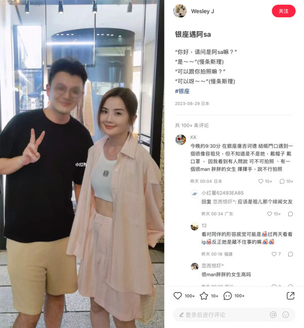 自2017年與石恆聰爆出戀情的阿Sa最終忍痛分手,回復單身後阿Sa雖然被網民在北京和溫洲機場偶遇,更被指一面憔悴。但寄情工作的阿Sa似乎很快便走出失戀的傷痛,日前有網民在社交平台分享在東京銀座偶遇阿Sa的合照,更分享了二人間的對話: