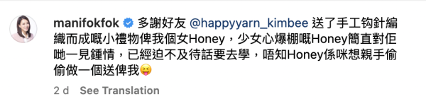 自從公布女兒Hanni的存在後,Mani不時都在社交平台分享Hanni的日常生活照,日前Mani在社交平台上載了Hanni的照片並寫道「多謝好友甘比送了手工鈎針編織而成嘅小禮物俾我個女Honey,少女心爆棚嘅Honey簡直對佢哋一見鍾情,已經迫不及待話要去學,唔知Honey係咪想親手偷偷做一個送俾我。」