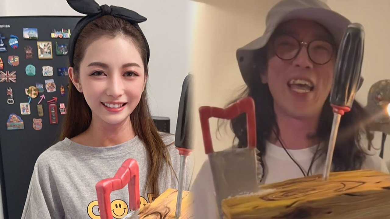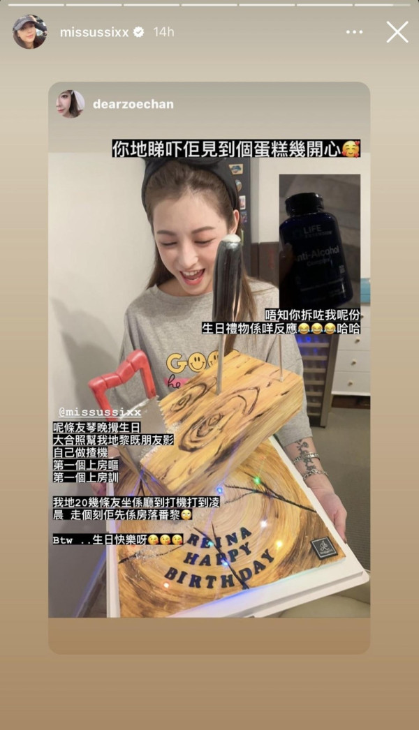 原來身為「愛妻號」的陸永送給太太一個親手製造的「木工蛋糕」,Reina透露剛剛見到有被嚇到但就大讚老公「整蛋糕嘅人叻,諗蛋糕嘅人都好叻!」而最巧合的是Reina與奶奶同月同日生日,所以她都有祝奶奶生日快樂,「新抱同奶奶同月同日生日嘅機率有幾大 奶奶生日快樂with me」。