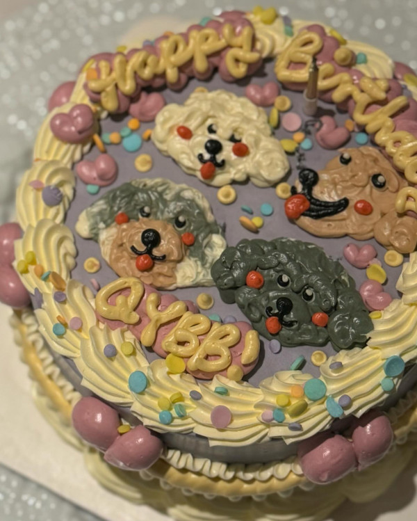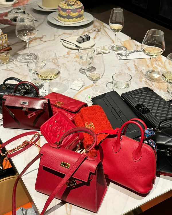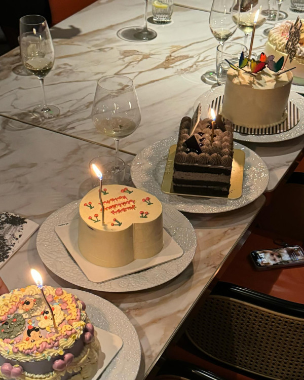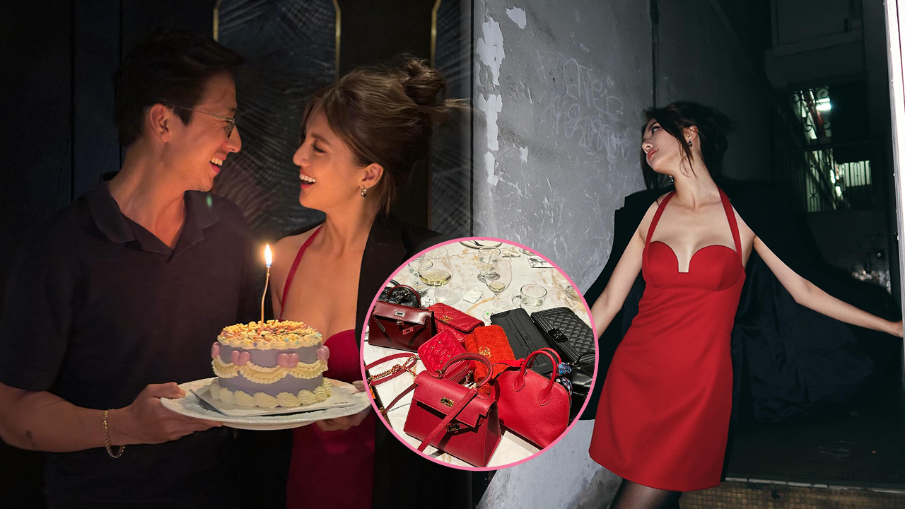 壽星女Karena在IG留言寫下,「30 而已」,見到在派對上又收花和5個生日蛋糕,不過當中最Sweet必定是一個以紫色為主色,上面畫有4隻Karena愛犬頭像的蛋糕,生日牌則寫上「QYBB」,相信就是「千語BB」的普通話拼音!而相信送上這個蛋糕就是Karena男友Brian,因為其中一張相就是二人甜笑互望一齊捧著蛋糕,放閃程度爆燈。另外同場出席的名媛好友,將多個限量版品牌手袋擺滿枱面,保守估計都已超過50萬,相當豪華。