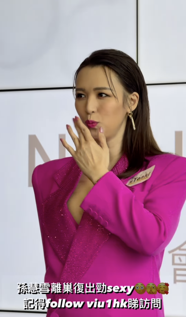 現年41歲的孫慧雪早前宣布離開效力18年的TVB,離開後的她工作量不跌反升,她更在社交平台上分享相片並寫道:「繁忙的工作,加一把勁來過渡。這個月,突如其來的充實」。前日出席豐胸代言活動的她更「大解放」,一身桃紅色西裝中門大開,令人眼前一亮。