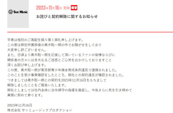 高木聰一朗所屬事務所Sun Music發表聲明道:「高木聰一朗因涉嫌違反《東京都青少年健全育成條例》而被逮捕,經過確認,高木聰一朗已違反了合約,因此於16日正式解除了與高木聰一朗的合約。」同時也對事件相關人士表示深深的歉意,並承諾未來將全面加強法律法規遵守的指導。