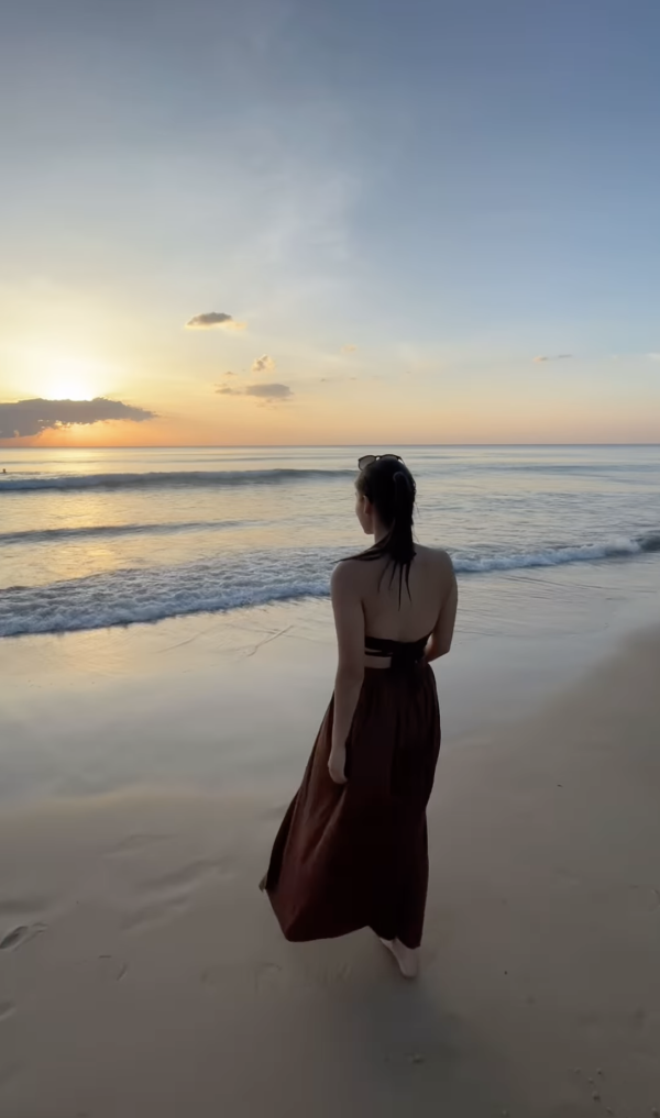 近日她在社交平台上分享了一段身穿泳衣,在海邊散步的影片,甚少有性感穿搭的她在影片中穿上deep V啡色紅泳衣,露出白滑美背,網民都不禁留言道:「未見過你咁性感!」,而她亦在留言中提及自己開設的新公司,得到不少網民與好友的祝福與鼓勵。