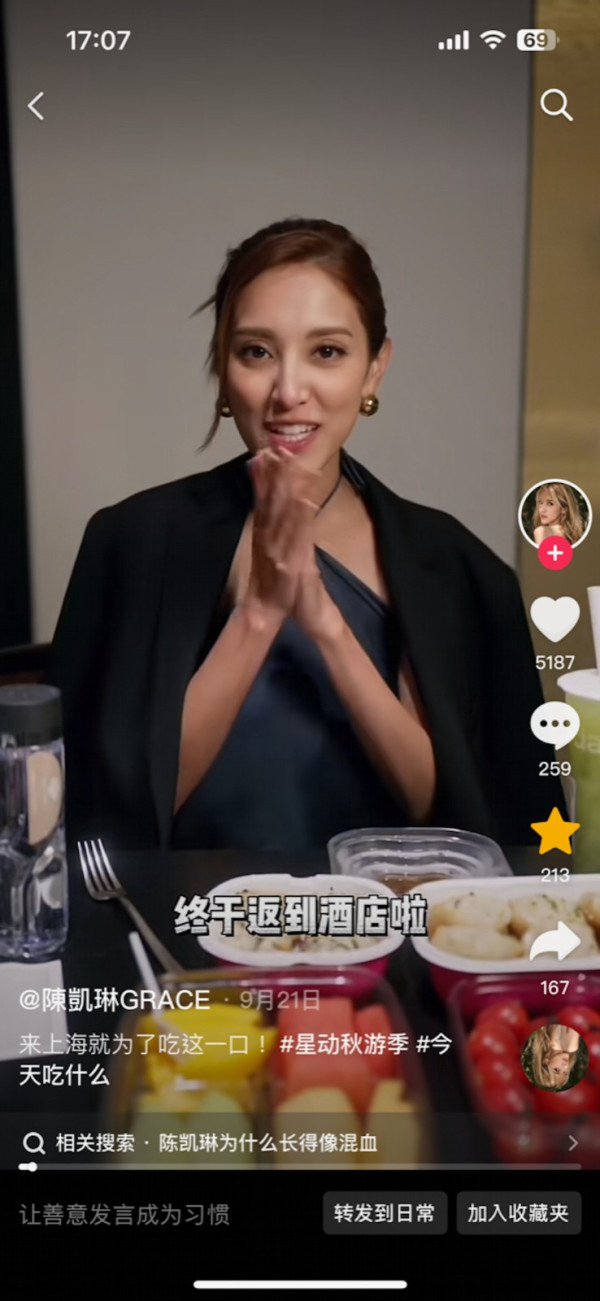 陳凱琳雖然已是人妻兼三子之母,但絕無半點師奶味,身材亦未走過樣,多年以來都很Fit。不時要公幹工作的她都會品嚐當地的地道美食,早前更在社交網分享她所吃到的美食,片中她正在吃外賣生煎包吃得津津有味。但則有不少粉絲羨慕她吃不胖的體質!