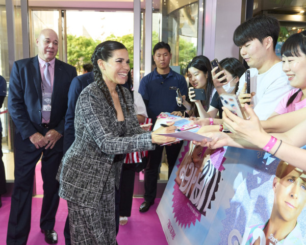 當日,《Barbie》電影團隊到韓國舉行首映禮宣傳,受到韓國觀眾熱烈歡迎。Margot在粉紅地毯上以全身都是粉色的打扮亮相,完全是行走的Barbie公仔!之後更換上粉色背心連衣裙,成為全場焦點。