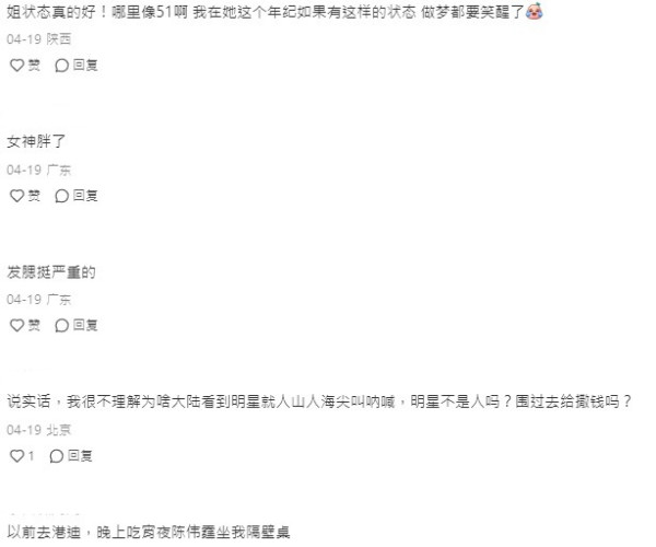 不過有網民看到照片後表示「51歲,老師奶了!」、「女神胖了」,但亦有網民指「從小到大的偶像!!!仲系甘靚女!!!」、「身材長相優越」、「她還是很漂亮呢,皮膚又緊緻!」、「皮膚太好了!」。