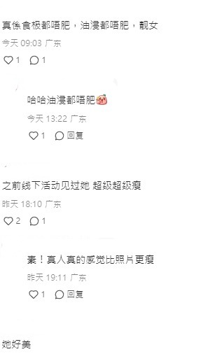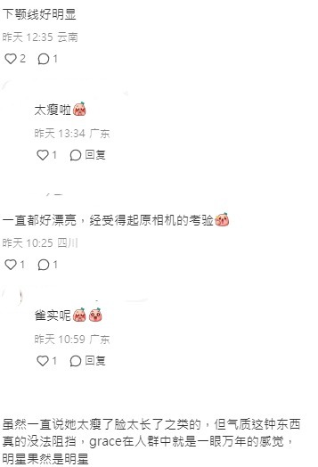 在沒有修圖的情況下,Grace的美貌完全驚艷網民,指「好漂亮,這才是港姐冠軍的顏值」、「真的超級上鏡啊!」、「真係食極都唔肥,油浸都唔肥,靚女」、「下顎線好明顯」、「一直都好漂亮,經受得起原相機的考驗」、「雖然一直說她太瘦了臉太長了之類的,但氣質這種東西真的沒法阻擋,grace在人群中就是一眼萬年的感覺,明星果然是明星」、「生了三個小孩還是骨瘦如柴,這什麼體質啊」。