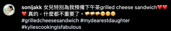 Sonija在社交平台分享的照片底下留言,「女兒特別為我預備下午茶grilled cheese sandwich」,更寫道:「真的,什麼都不重要了。」,疑指自己已經不再介意早前亡父遭抹黑的事件。女兒Kylie的樣子與爸爸朱少傑如同餅印,而在女兒背後的Sonija則罕有以素顏上陣,兩母女的樣子十分幸福。