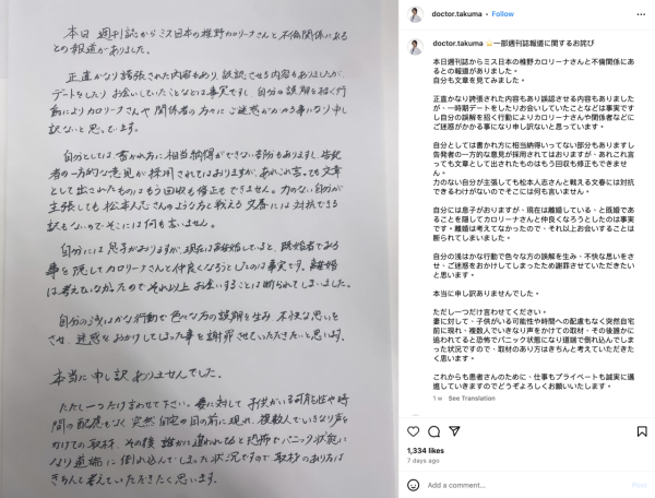 烏克蘭裔日本小姐椎野卡羅利娜(Karolina Shiino)在成功贏得日本小姐后冠後,卻成為了媒體和公眾關注的焦點。《週刊文春》爆料指她與人夫、著名「筋肉醫生」前田拓摩有不當男女關係,引起了廣泛討論和爭議。