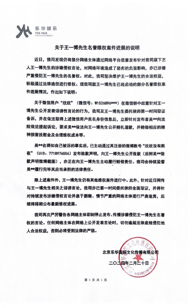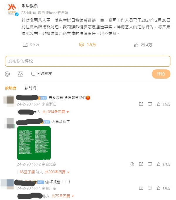 昨日樂華娛樂再於社交平台發聲明,表示「我司強烈譴責惡意捏造事實,誹謗藝人的違法行為,將嚴肅追究發布、散播誹謗言論主體的法律責任,絕不姑息。」隨即不少粉絲都在貼文下留言表示「支持偶像追究到底」,並指「惡意誹謗的都抓起來告!」。