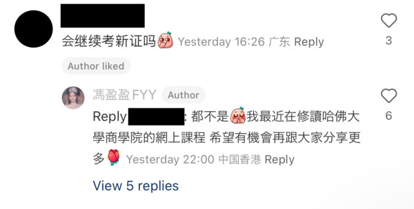 她發佈的VLOG片段中可見她早上6時便回到TVB化妝工作,收工後再趕回大學上堂present,行程十分緊湊。除了恭喜的留言外,網民趁機追問馮盈盈畢業後有沒有轉行的打算,盈盈則回應:「不是啊」,亦有網民追問盈盈有繼續考新證的打算嗎?馮盈盈表示雖然不會考新證,但她正在修讀哈佛大學商學院的網上課程,不愧是港大女神!