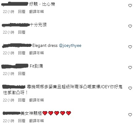 網民看過相片後隨即大讚「白滑靚長腿」、「太索了吧😍?」、「好靚啊joey係唔係又瘦咗」、「我暈了!」、「太有女人味!」,而圈中好友吳若希就笑言「終於似返個女人啦😂」,鄭衍峰亦笑指「會唔會太女人?」。
