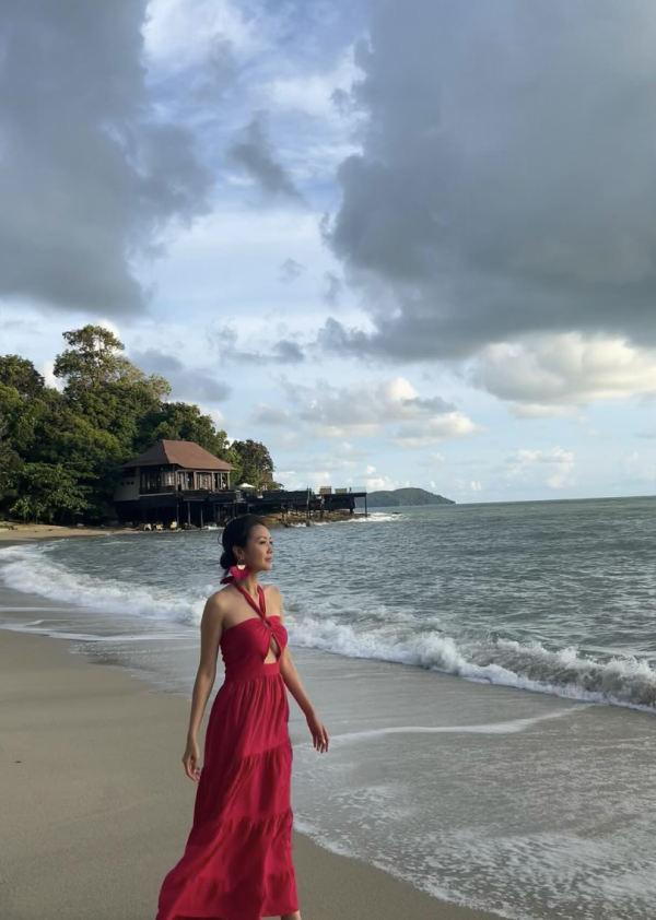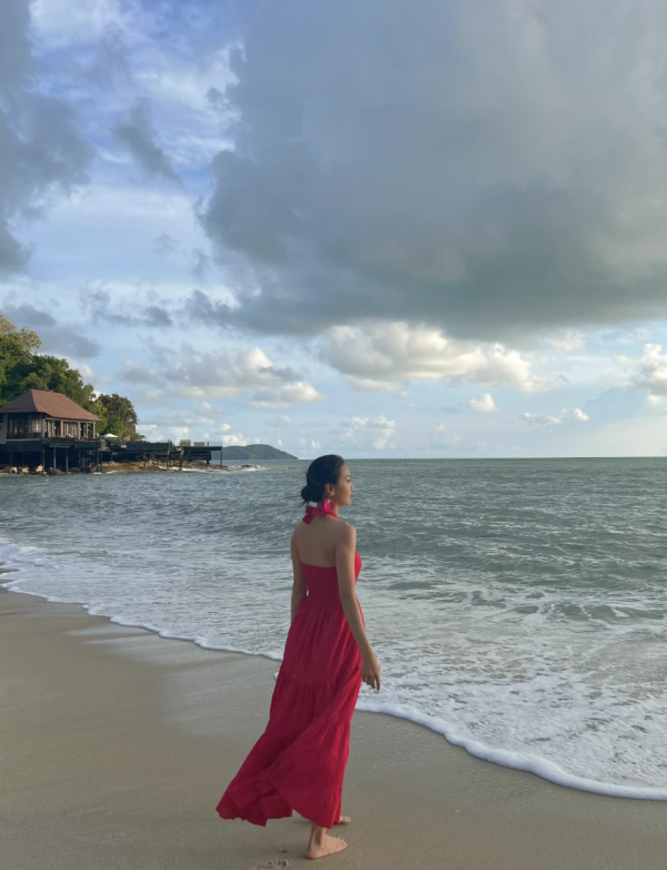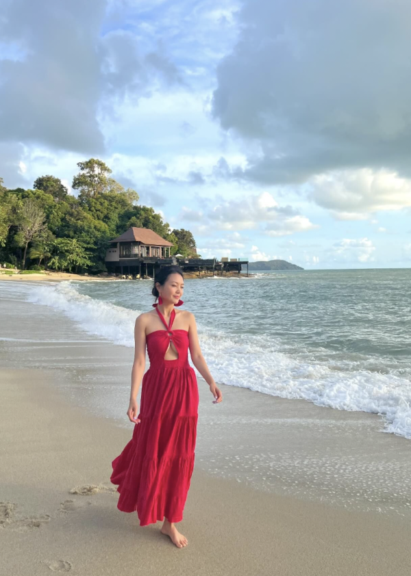 相中的她穿著紅色長裙漫步在海邊,掛頸長裙除了露出美肩美背外,最大的亮點莫過於心口前的大窿,性感的大開口可謂挑戰極限,Toby的南半球一覽無遺!網民紛紛大讚好性感,大派心心眼Emoji!
