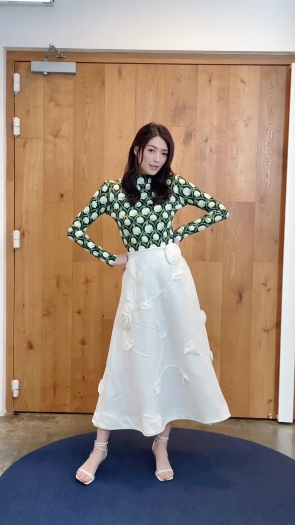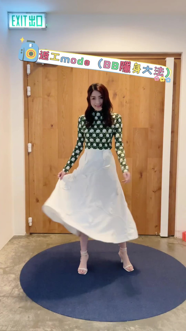 宣布與老公陳家樂造人成功的Shiga懷孕期間仍然努力工作密密掙奶粉錢,日前在社交平台上載懷孕工作幕後花絮時分享了兩套可以完美隱藏孕肚的工作服,本身擁有纖腰的Shiga選擇以高腰長裙配搭綠色圖案的上衣,從正面看可以完美隱藏孕肚外,女人味十足!