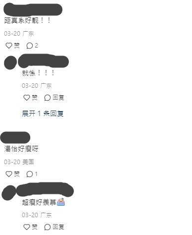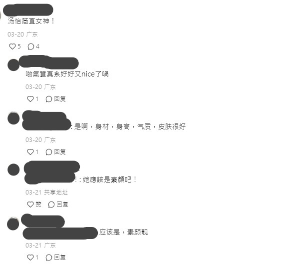 不少網民看過相片後紛紛在文中留言「好靚啊!」、「超靚!而且好nice」、「湯怡簡直是女神!」、「身材、身高、氣質,皮膚都很好」,有網友更表示「素顏的她一樣美!」。相中近看湯怡皮膚超緊緻,沒有半點皺紋,真的保養得超好!