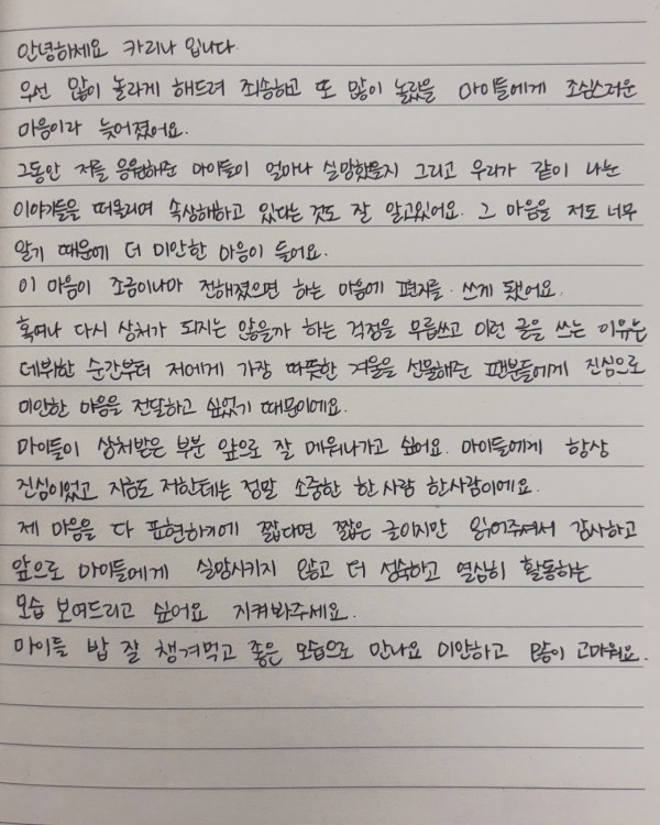 認愛8天後,除了Aespa出現脫粉潮,SM娛樂的股價都大跌,一直沉默的Karina終於在社交平台上載手寫信,表示「我(Karina)仍然希望透過這封手寫信,將心意傳達給大家,對從出道以來一直支持我的粉絲們,送給我溫暖冬天的粉絲們,表達最真心的歉意」雖然能在字裡行間感受到Karina的歉意,但粉絲的反應都十分兩極,一方面心疼Karina單純談戀愛都被攻擊,另一方面則覺得Karina挑選了不能談戀愛的職業,單是道歉信並不能平息粉絲的憤怒。
