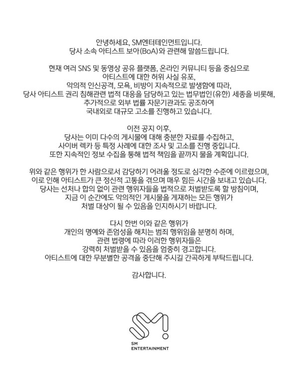 今次BoA在「引退宣言」後刪光IG所有貼文,是她出道以來首次在社交平台上做出如此大動作,SM亦發聲明指BoA因網上大量的失實及惡意評論令她的精神狀態十分差亦遠超她能承受的程度,所以暫時休息,公司正在搜羅証據並會進行法律程序起訴造謠者。網友及粉絲都十分擔心她更表示「希望SM能起訴黑粉,更希望BoA能暫時停用網路或SNS並好好休息」、「因爲(BoA)第一次這樣,所以很擔心,別再欺負她了」、「稍微休息一下也沒關係,只要健康地渡過就好了」等等暖心留言,希望這位韓流天后感受到粉絲對她滿滿的愛。
