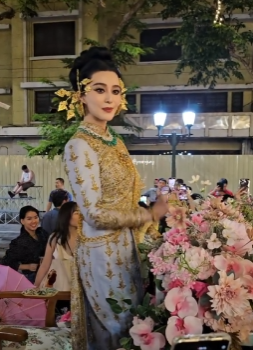 近日有位泰國網民在社交平台分享了近距離觀看范冰冰身穿泰服霸氣出巡的影片,並以「你是我的天使」為標題,配文「冰冰姐說泰语 ขอบคุณค่ะ 是谢谢的意思🥰我很努力學習漢語為了跟你說愛你姐姐❤️❤️」。影片中的冰冰身穿金繡花紋泰服,頭上插滿金葉飾品,再配搭綠寶石的頸鏈,顯得高貴優雅!冰冰站在佈滿鮮花的車上,熱情地向路人打招呼,親和力十足。首次以泰服造型示人的她引來網民紛紛大讚「美美的!」、「不管什麼環境都是最美」、「我的女神」、「還是這麼美」。