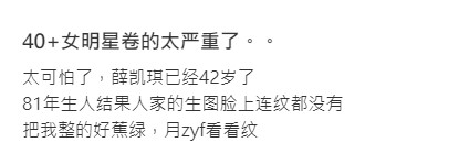 雖然外界對她的外貌有爭議,但對Fiona的人氣在內地完全毫無影響,綜藝節目工作一個接一個,吸金力超強!Fiona當日身穿黑色小背心加牛仔褲,露出小蠻腰之餘更留下一頭飄逸的烏黑長髮,加上精緻的五官,整體造型少女感十足獲網民激讚。而該網民留言當她看完Fiona的生圖後再看自己的皮膚就感到焦慮;「太可怕了,薛凱琪已經42歲了。81年生人結果人家的生圖臉上連紋都沒有。」