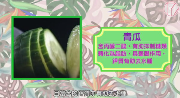 青瓜: 青瓜營養價值高且卡路里低,每碗只有15卡,0脂肪,是非常好的減肥食品。青瓜含有的果膠具整腸作用,能提高腸道蠕動,其富含的鉀質,亦有助去水腫。
