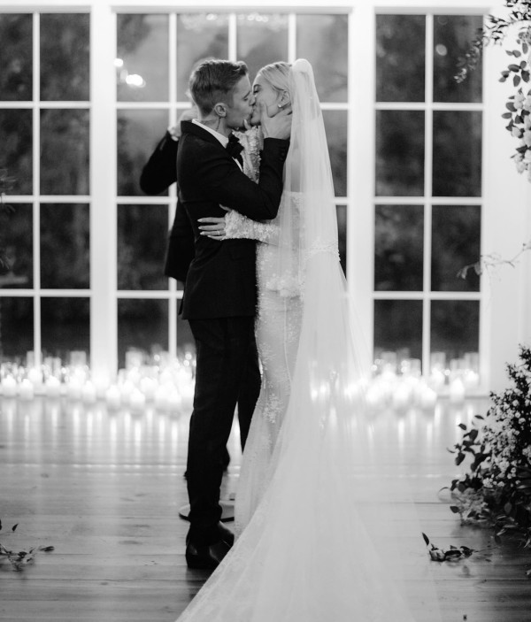 Justin Bieber分享與太太拍攝的黑白照,重現當年二人的婚紗照經典風格,見到拍攝當日甚至有牧師在場見證,兩人重新為愛宣誓,場面十分感人!其中太太Hailey更再度披上白紗,以透明蕾絲的長袖白紗禮服大曬孕肚。